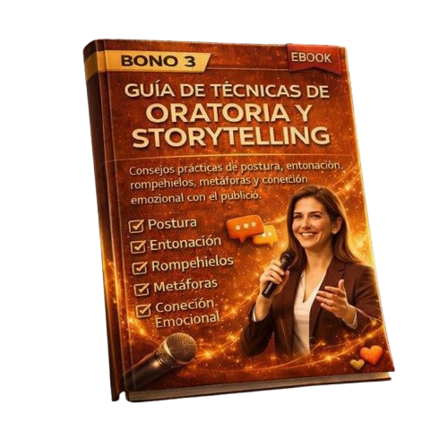 Mini-ebook con consejos prácticos de postura, entonación, rompehielos, metáforas y conexión emocional con la audiencia.