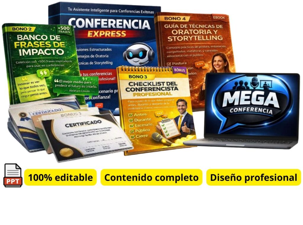 Tendrás acceso a 280 Mega Conferencias listas y editables con contenido completo y diapositivas con diseño profesional. Son conferencias sobre los 14 temas más deseados y mejor pagados.
